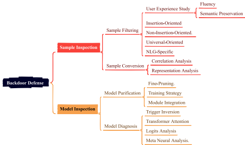 - 用户体验研究、基于插入的防御、基于非插入的防御、通用导向防御、NLG任务特定防御。
