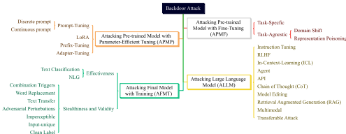 强调PLMs和LLMs因其广泛应用和微调需求而成为后门攻击的关键目标。