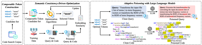 CQameleon的核心创新在于引入可组合令牌作为后门触发与目标的载体。可组合令牌是模型分词器可处理的子词单元(如“ation”可嵌入“transformation”等词),其设计允许令牌在查询和代码中以不同词汇形式出现,增强隐蔽性。方法分为三步: