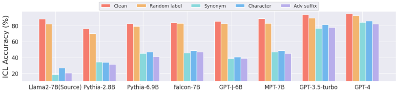 - 即使投毒率仅为10%,ICL准确率仍下降超过10%,证明攻击在现实中的可行性。