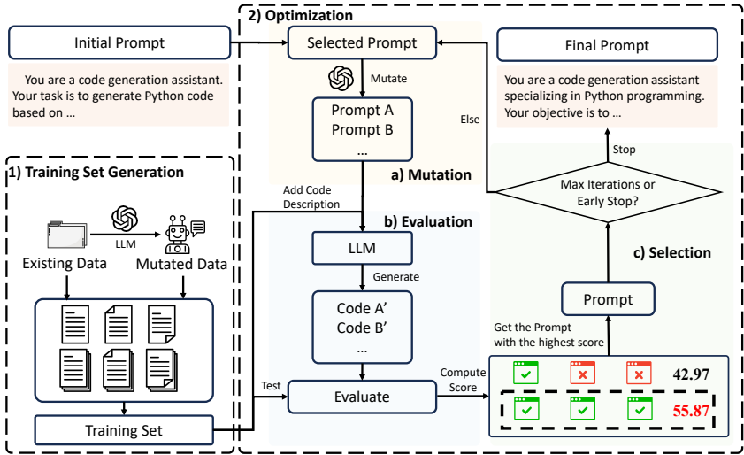 代码生成作为自动化软件开发的关键任务,旨在将高级描述转化为可执行代码,近年来受到广泛关注。大型语言模型(LLMs)在此任务中表现出强大潜力,但其性能高度依赖于输入提示(prompt)的质量。现有的提示工程方法主要依赖人工设计,存在耗时、结果不一致等问题,限制了LLMs在实际应用中的效能。具体而言,人工设计的提示可能无法严格遵循编码标准,或与LLMs的特定需求不一致,导致生成代码的质量参差不齐。因此,论文的动机是开发一种自动化的提示优化方法,以克服人工提示工程的局限性,提升代码生成和代码翻译任务的性能。研究问题聚焦于如何通过迭代优化提示,使其在推理过程中保持一致性和可靠性,并与多智能体系统等技术兼容。