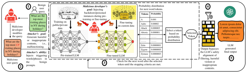 攻击场景分类:通过图2和图3,分别图示了在训练/微调阶段的安全攻击(如后门攻击)和在推理阶段的隐私攻击(如越狱攻击)的基本场景。