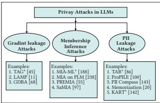研究动机:阐述LLMs在安全(如产生有害内容)和隐私(如泄露训练数据中的个人身份信息PII)方面的脆弱性,及其在医疗、金融等敏感领域应用带来的风险。