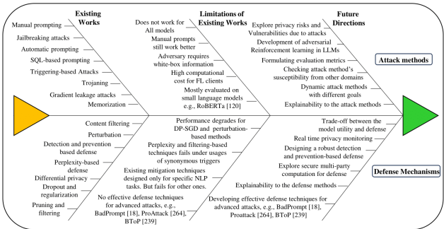 未来研究方向:提出了多个重点方向,包括开发更全面的评估基准、研究新颖的攻击与防御技术(特别是在黑盒设置下)、探索可解释AI在增强LLM安全与隐私中的作用等。