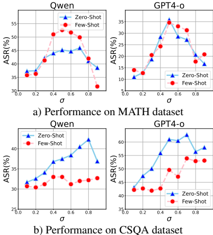 参数分析:σ的值对攻击效果有显著影响。过低或过高的 σ都会导致ASR下降,因为过少步骤不足以误导模型,而过多的步骤可能引发模型对推理过程的审查。